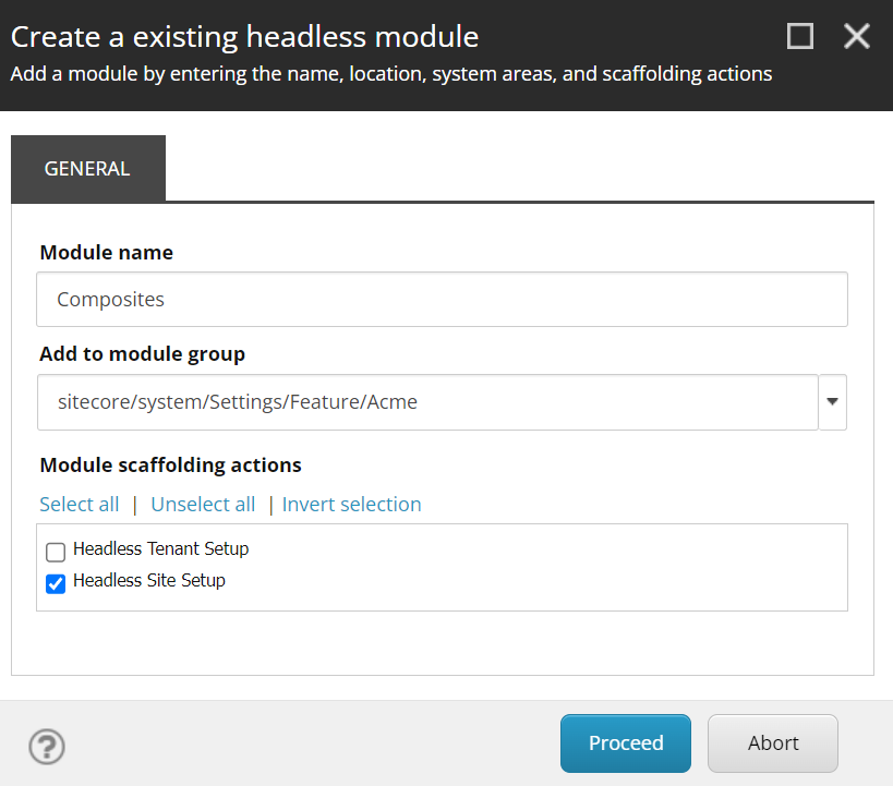 In the Dialog the group and scaffolding actions are already pre-selected and you only need to enter the module name, for example:Composites.