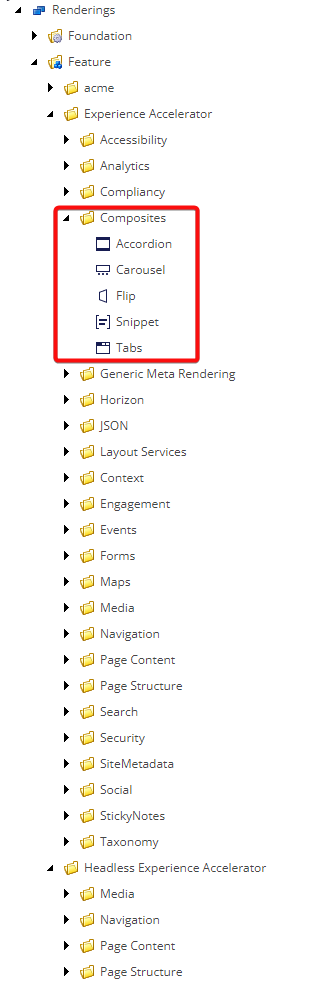 You see the Composite module includes Accordion, Carousel and ... . Because the Sitecore pages use the rendering folder structure under the rendering to organize the toolbox, you can create the rendering folder and move existing rendering around and check it in Sitecore pages: