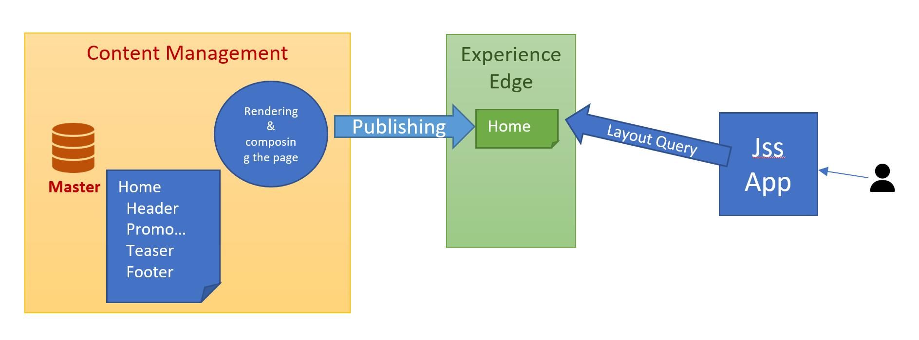 During the publishing process, the layout of the page will be rendered and the rendered result will be pushed to the experience edge. When the frontend application needs to access a page, it will send a layout query to Experience Edge and will get the whole contents of the page.
